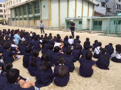今回の避難訓練は火災時の訓練です。みんな口にハンカチを当てて煙を吸わないように真剣に避難しました。
