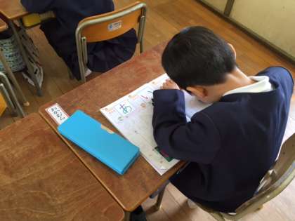 「少し直すときれいになるね。」と言われた字は机に戻りきちんと書き直しに取り組んでいました。姿勢よく字を書く姿もやっぱりスーパー1年生です。