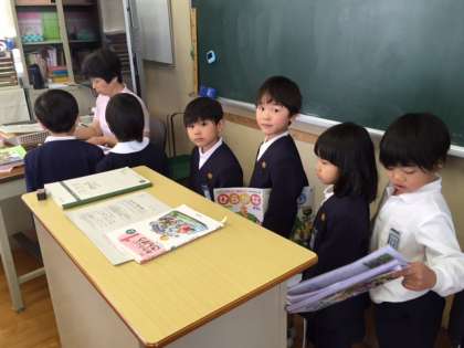 書けたら担任の先生のところに持って行き、形やバランスに気を付けていねいに書けている字に花まるをもらって大喜び。