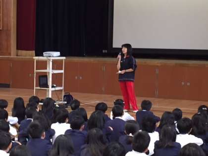 今日は英語の中核教員が中心となって「English Time」を児童集会で行いました。