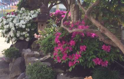 本校自慢の築山です。大きな鯉が優雅に泳ぐことも自慢ですが、5月が近くなるこの時期には、毎年このように美しい花が楽しめます。