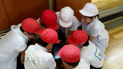 今回は、今年度から40台導入されたタブレット端末を活用して、自分たちの踊っている様子をチェックしあいました。