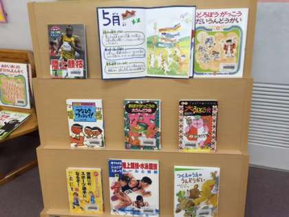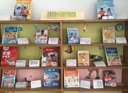 「スポーツをテーマにした図書」を図書委員が職員室廊下、図書室内に並べてくれています。