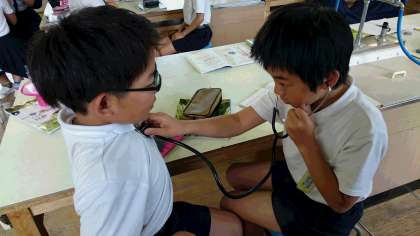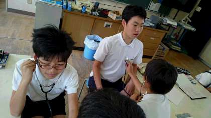 「消化と吸収」、「呼吸のはたらき」に続いて、今は「心臓と血液のはたらき」について理解を深めています。昨日は、心臓の拍動が血管を伝わり脈拍として手首や首の下で感じられることについて、観察実習をおこないました。
