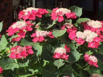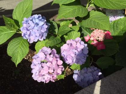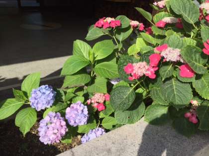 本校の玄関には、6月の訪れを知らせる額紫陽花と紫陽花が美しく花を咲かせています。
