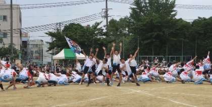 集団行動の後は、手作りの法被をまとい、力強い南中ソーランの踊りが会場を圧倒しました。