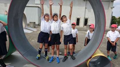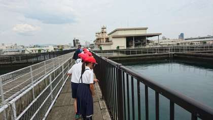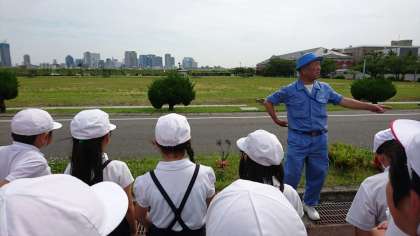 施設の見学の様子です。実際に地中に埋められている排水管の大きさを体感しました。また、芝生の下には、大阪市民の生活を支える水が蓄えられています。なんとこの配水池は102年前にできたものだそうです。