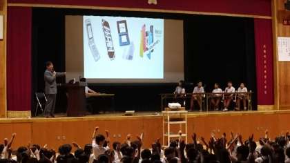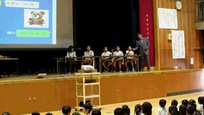 子どたち向けに「ケータイ・スマホ」について、講演をしていただきました。舞台には、4年生〜6年生の各クラスの代表・保護者の方からの代表が座って、質問に答える場面もありました。