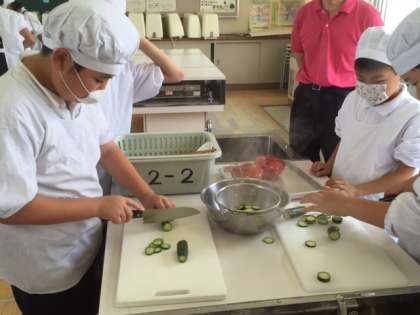 包丁の使い方を学び、ガスコンロでお湯を沸かしてきゅうりを湯がきました。