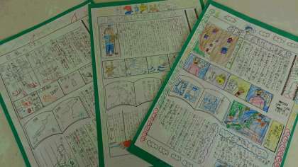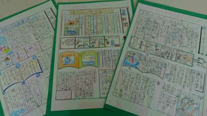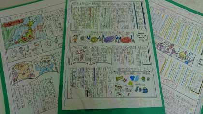 5年生は1学期の最後の理科の単元である「台風と気象情報」の学習で、調べたことを一人一人が新聞にまとめました。