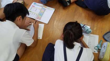 毎時間恒例の、フォニックス。今日は、カトリーナ先生の声を聴いて、どのアルファベットなのかを探し、チームごとに取り合いました。難しい発音もあり、苦戦する一面も・・・。