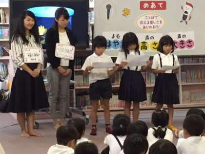プロの読み聞かせの後は、絵本の一場面を3年生の児童が役割を分担して読み聞かせを行いました。