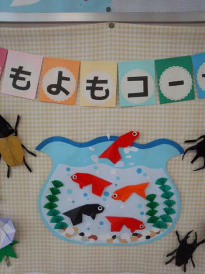 図書室のよもよもコーナーには、地域ボランティアよもよもさんの夏を感じさせる手作り掲示が飾られています。