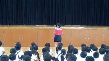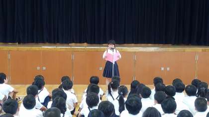 「1学期をふり返って」をテーマに、3年生・6年生それぞれ2名ずつの代表が作文を発表しました。
