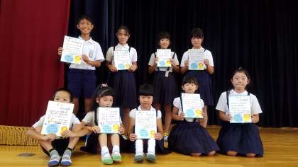 各学級ナンバー1の読書量を誇る児童に校長先生から「読書賞」の賞状が手渡されました。最後にみんなで記念撮影。