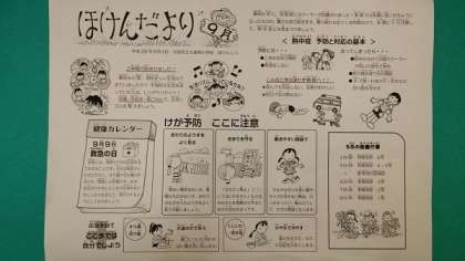 9月のほけんだよりでは、9月9日は救急の日、けがの予防や応急手当の方法について、そして、まだ夏の暑さが残るこの時季、熱中症の予防と対応の基本について載せています。
