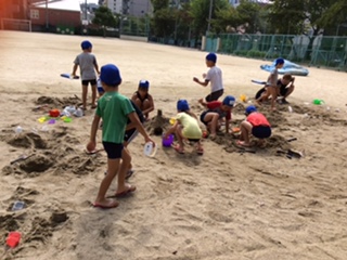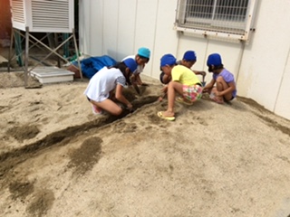思い思いの場所で、山を作ったり、穴を掘って水をためたり、カップを使って型抜きしたり、思う存分造形遊びを楽しんでいました。
