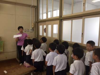 担任の先生のお話をよく聞いて、機敏に行動していました。1列・2列・4列の並び方しっかり覚えられたかな。