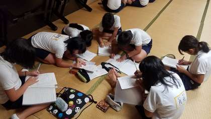 グループごとに修学旅行1日目の活動をふりかえり、その後、全体で共有しました。
