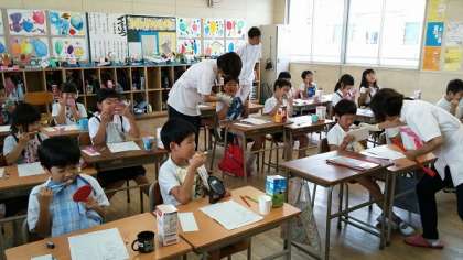 ポイントは小刻みに1本づつていねにみがくとこ。みんな歯みがき名人目指して、鏡を見ながら真剣にみがいていました。歯みがきの後の染色では、ほとんどの人が赤く染まらなくなって「すごーい!」と喜んでいました。