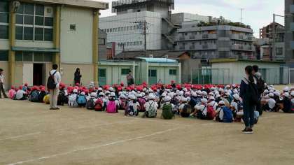 大阪城公園での全校たてわりオリエンテーリングに向けて、児童は先ほど元気に学校を出発しました。少し肌寒い気候ですが、児童がのびのびと活動するにはちょうどいいかもしれません。ただし、健康・安全にすごすために、出発の時には学級担任だけでなく全教職員、そして班のメンバー全員で健康観察をしっかり行いました。