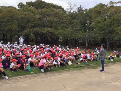 子どもたちは、児童会担当の鳥枝先生の注意事項を聞いて出発。