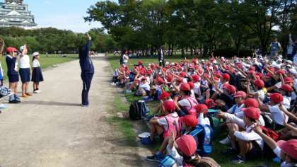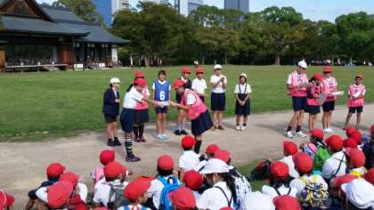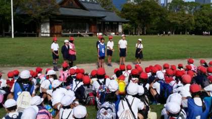 オリエンテーリングで楽しみ、たてわり班での昼食、広い芝生の上でたてわり班で駆け回り・・・