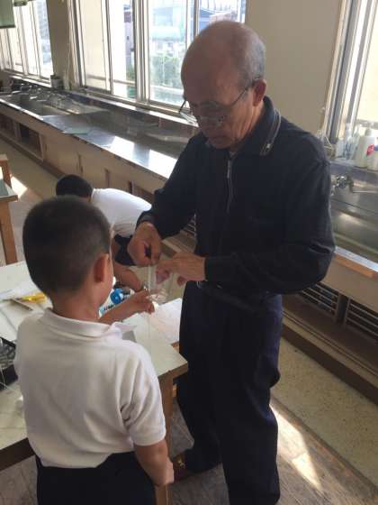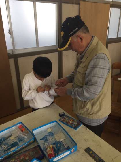 ぶんぶんごまと糸電話の作り方の説明を聞いた後、地域の方々に手伝ってもらいながらおもちゃ作りを楽しみました。穴をあけたり、ひもを結んだり難しいところは地域の方々に教えていただき、子どもたちはとても喜んでいました。