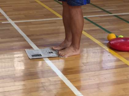 新聞ギャザー⇒新聞紙を足指だけで丸めていきます。