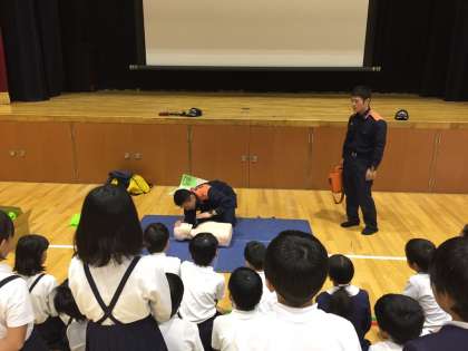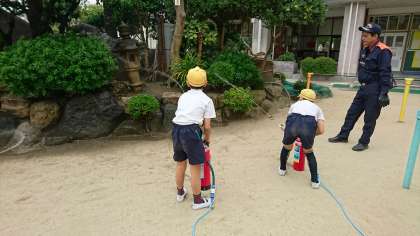 3・4年生は水消火器の初期消火、簡易担架の作成