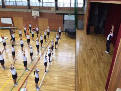 4年生は、初めて台上前転に挑戦しました。最初に本時の運動に必要な準備運動を入念に行いました。
