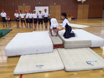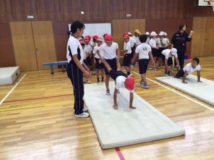 台上前転にも臆することなく取り組めるような場づくりが工夫され、1時間目とは思えないぐらい軽快に回転ができる児童が大勢いました。少し補助をすると、4年生全員が台上で回転できました。