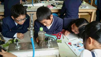 いずれの実験も、その学習時間内に3つの層に分かれることや、泥が遠くまで運搬され堆積するという考察をすることはできました。時間を置いて、それらの層がどのようになるか、また来週詳しく観察をします。
