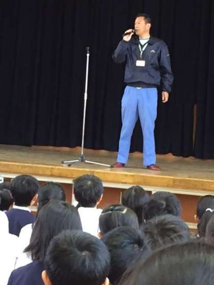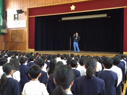 11月7日(月)朝会で西区役所市民協働課の岩崎さんが「交通安全講話」をしてくださいました。