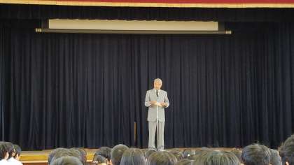 次に、今日は区役所のニッシーパトロール隊の方が来られています。お話の前に先生の方から一言。毎朝玄関に立って登校してくるみなさんと挨拶をしていますが、学校前の横断歩道の信号を守れていない人を時々見かけます。地域でも信号のない道路をむりやり横断している人をよく見かけます。大きな事故は、忘れた頃にやってくるということを知っておいてください。