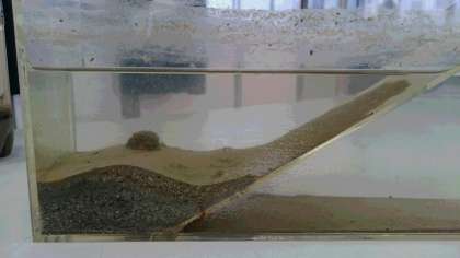 今日の観察で、流れる水によって運搬されてきた地砂は、河口に近いところに礫、その上に砂が堆積していることや、小さな軽い粒である泥は海岸から遠くまで流されて沈むことがわかりました。