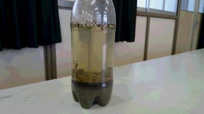 6年生は、先週、礫・砂・泥を混ぜた土を水で流し、それらがどのように層を形成するかを実験しました。