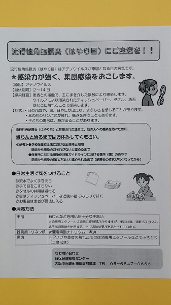 大阪市内において、今年の7月以降、流行性角結膜炎(はやり目)の患者が例年に比べて多く報告されおり、原因となるアデノウイルスは非常に感染力が強く、家庭や保育所、学校などでの集団生活を通して感染が広がっているそうです。