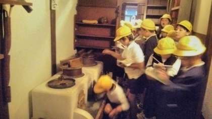 ホールでのお話の後は展示室に移動し、江戸時代の町を歩き、「ここはいったい何屋さん?」と店頭に並んでいる品物を見て当てたり、台所に入ってかまどの様子を観察したりとみんな興味津々に見学をすることができました。