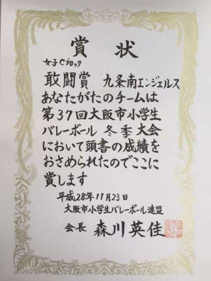 九条南子ども会「九条南エンジェルス」が11月に行われた第37回大阪市小学生バレーボール冬季大会で敢闘賞に輝きました。