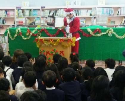 まず初めにクリスマスに関するクイズコーナーがはじまりました。みんな何問正解したかな?次に皆の呼ぶ声に合わせて校長先生によく似たサンタクロースが登場!「サンタクロースのおてつだい」という本を読んでくださいました。