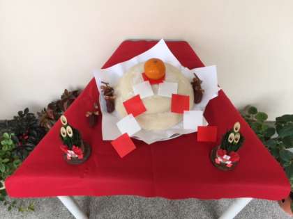 12月22日(木)校長室の前に、12月4日(日)「九条南連合餅つき大会」で子どもたちが力いっぱい杵をふってつきあげたお餅で作った鏡餅が今年も登場しました。