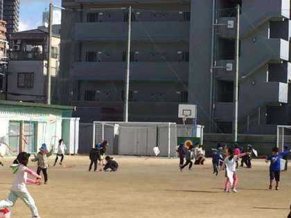 自作の凧を九条南小学校の校庭で元気に揚げていました。