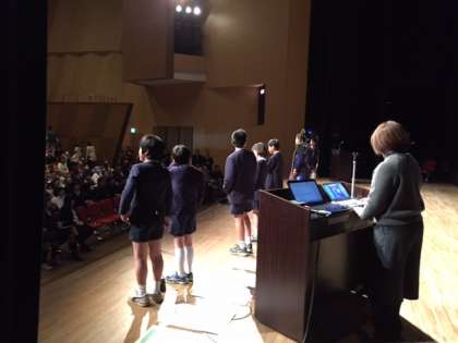 自作のポスターや啓発CM動画を織り交ぜ、4年生全員の思いや考えを演技力抜群の劇でプレゼンテーションしました。会場には笑い声や感嘆の声、そして割れんばかりの拍手が何度も起こりました。