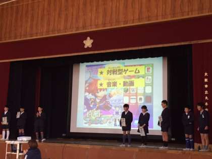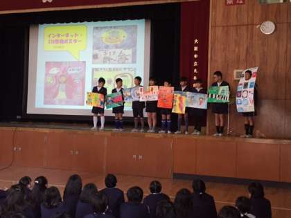 本校では、2月13日(月)1時間目に「OSAKAスマホサミット2016」で実践事例報告において最優秀賞を受賞した4年生の発表と本校の1年生〜6年生に実施したアンケート結果をもとに「スマホやインターネットの安心・安全について」健康委員会が検証した内容をプレゼンテーションしました。