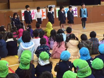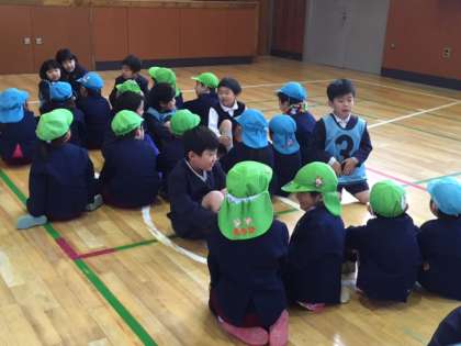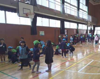 1年生は、14日(火)に九条幼稚園と福音幼稚園との幼小交流会をしました。生活科で地域の方に教えていただいた昔遊びと、自分たちで作った手作り遊びで楽しんでもらいました。「けん玉」、牛乳パックで作った「パッチンがえる」、色紙で作った「紙コプター」、段ボールで作った「空気砲」、新聞紙で作った「輪投げ」の5つのコーナーです。