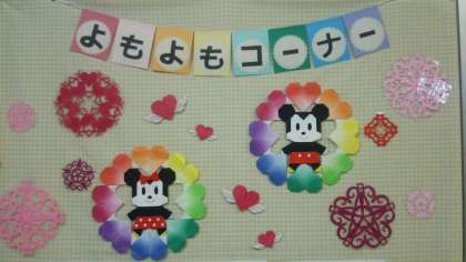図書室の掲示板です。九条南小学校にはミッキーとミニーのように仲良しがいっぱい♪天気の良い日は運動場で元気に友だちと鬼ごっこ、ドッジボール、縄跳び、体をのびのびと動かしている子どもたちがたくさんいます。