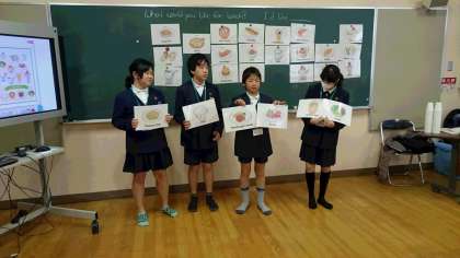 の表現を使って発表しあいました。とても栄養バランスのとれた献立もあれば、「本当に食べきれるのかな?」と思うような献立もありましたが、グループの友達と協力し合って、上手に発話できていました。