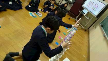 5年生は今まで学習した様々な表現をタワーゲームで復習しました。一人一人順番に回答権がまわってくるので、タワーも高くなり、ハラハラドキドキした復習タイムでした。