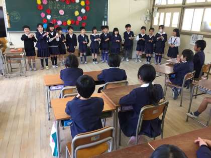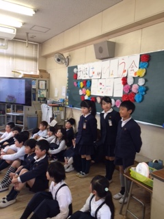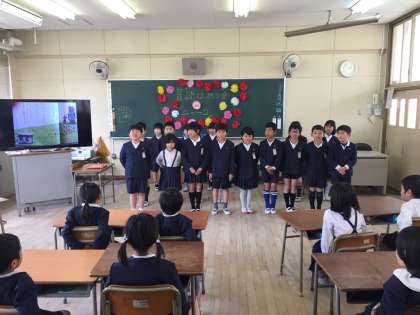 2年生は国語科で「ニャーゴ」の学習をしています。1年生に紙芝居をすることを目標に今日まで練習してきました。場面の様子や登場人物の気持ちにあった読み方を工夫し練習してきました。1年生を教室に迎えると、ドキドキわくわくしている様子でした。本番は今まで練習してきた成果がしっかりと発揮できました。1年生から「とても聞きやすくて楽しかったです。」「ねこのセリフがとても上手でした。」などのたくさんの感想を言ってもらいました。1年生からお礼に入学式で歌う「ともだちになるために」を歌ってもらいました。とても楽しい発表会になりました。